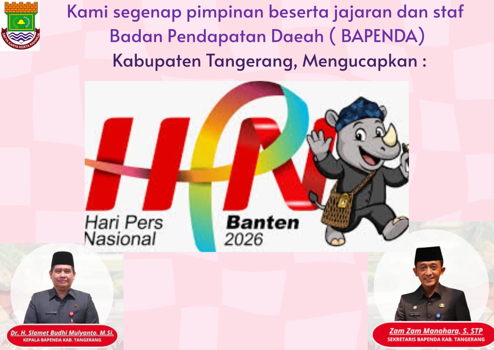 Kami Segenap Keluarga Besar Pimpinan Beserta Jajaran dan Staf : Badan Pendapatan Daerah ( BAPENDA ) Kabupaten Tangerang, Mengucapkan : ” Selamat Hari Pers Nasional ( HPN ) 09 Februari 2026, Semoga Insan Pers Selalu Menjunjung Tinggi Etika Jurnalistik dan Tetap Menjadi Garda Terdepan Dalam Menyampaikan Informasi. “